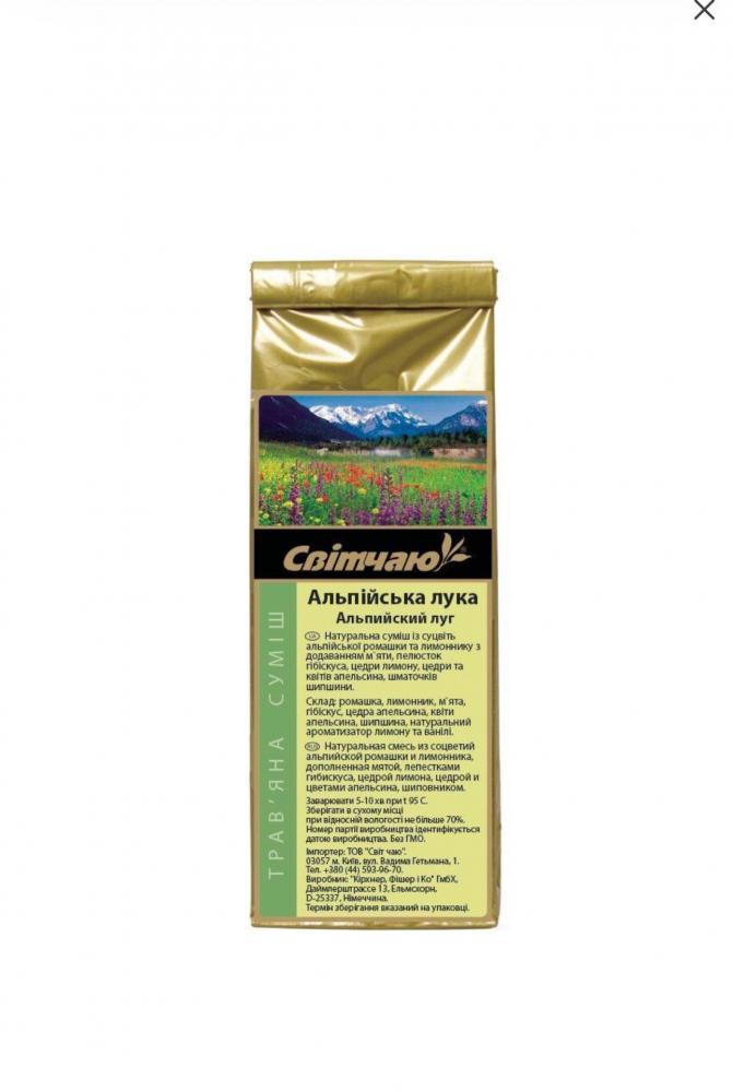 "Альпійська лука" - це  натуральна суміш із суцвіть альпійської ромашки та лимонника з додаванням м`яти, пелюсток гібіскуса, цедри лимону, цедри та квітів апельсина, шматочків шипшини.